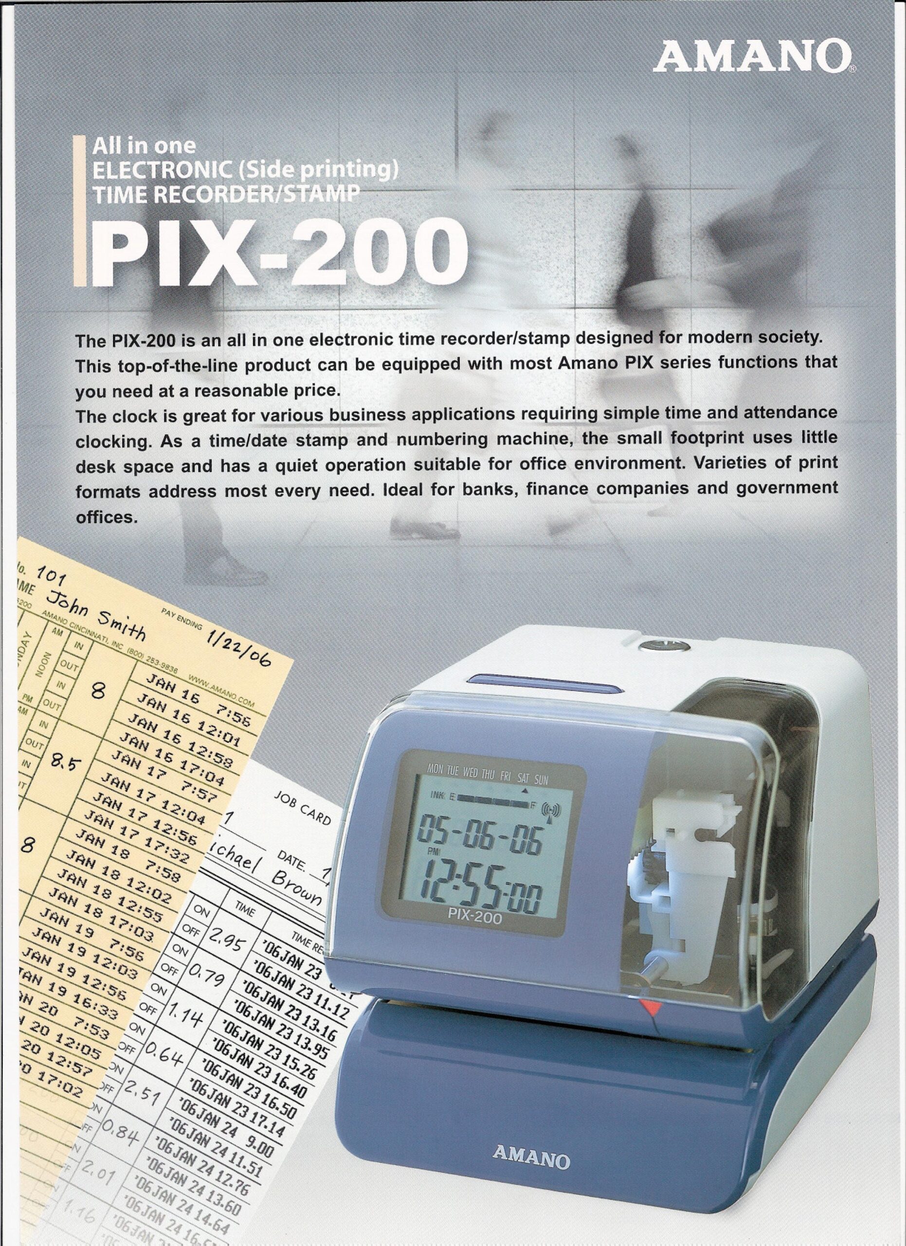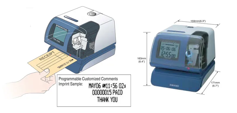 AMANO Time Stamping Machine PIX-200 is standout feature is the Atomic Time Synchronization capability (via NTP server or radio signal), which ensures 100% accuracy for legally sensitive documents, banking slips, and employee time cards. Designed for ease of use, the AMANO Time Stamping Machine PIX-200 features a large, back lit digital display and an illuminated print window that allows users to align documents perfectly before stamping.