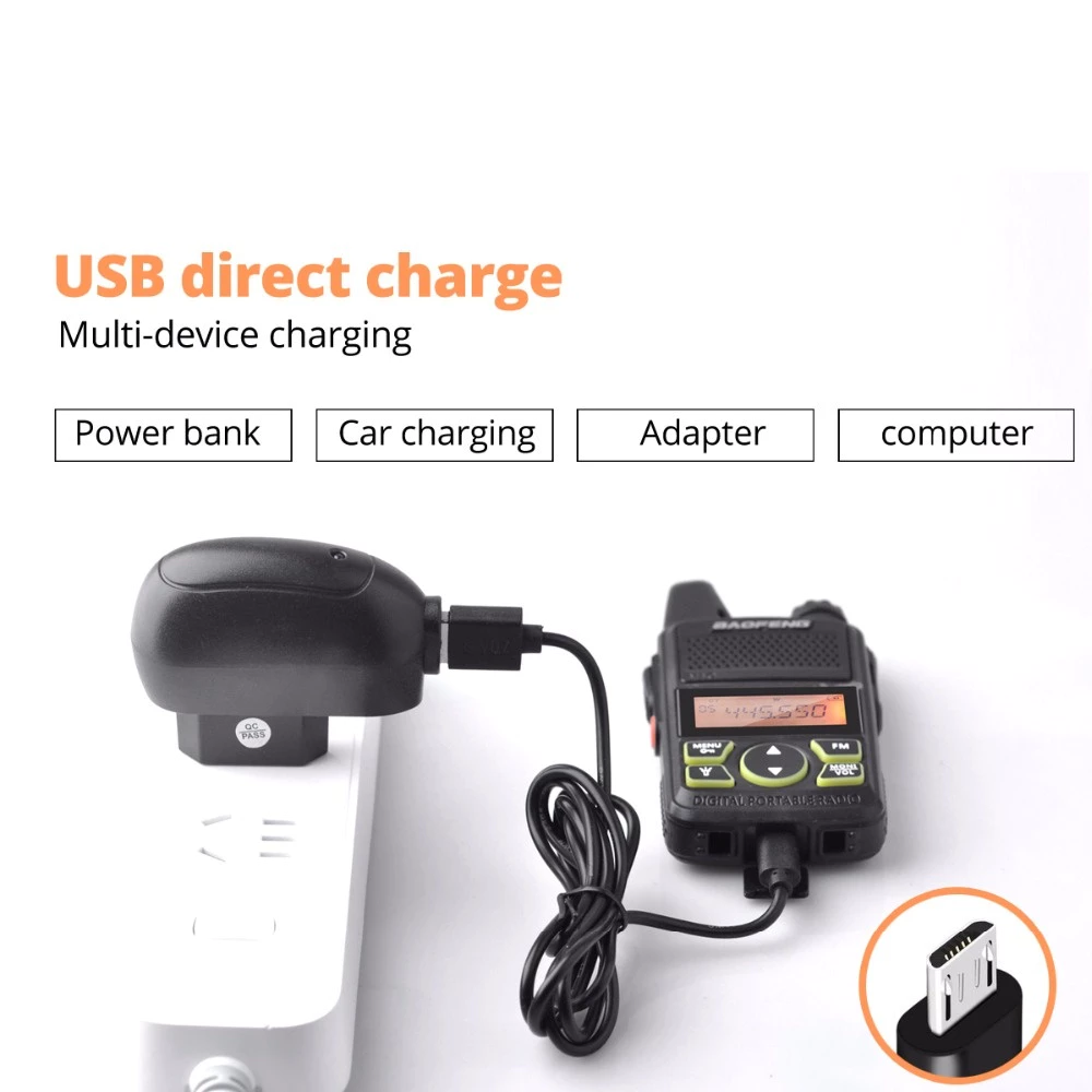 Unlike traditional walkie talkies that require a charging cradle, the BAOFENG Walkie Talkie BF-T1 charges via a standard Micro-USB cable, just like an older Android phone or power bank. It features a bright, clear digital display and simple buttons for volume and channel switching.