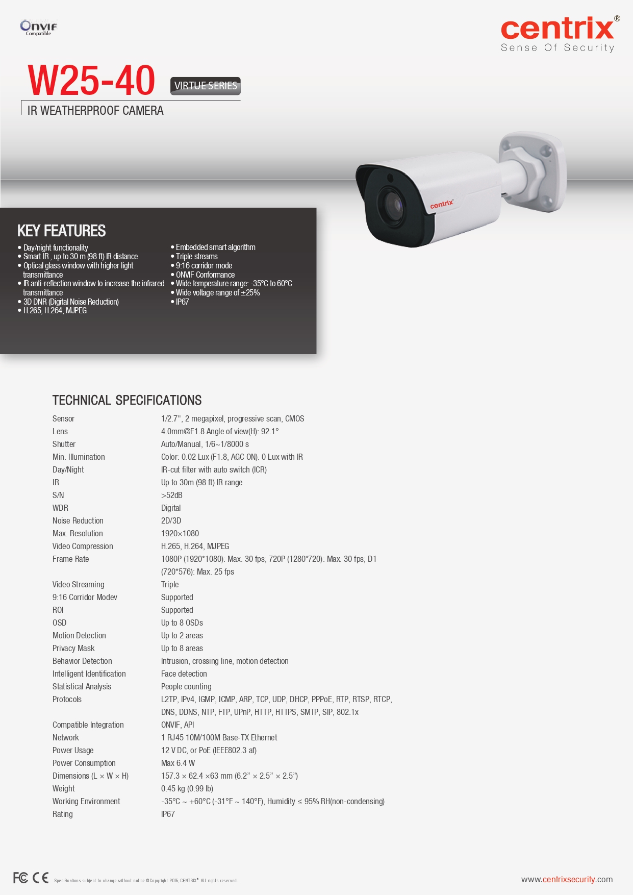 - Sensor : 1/3″, 2.0 megapixel, progressive scan CMOS