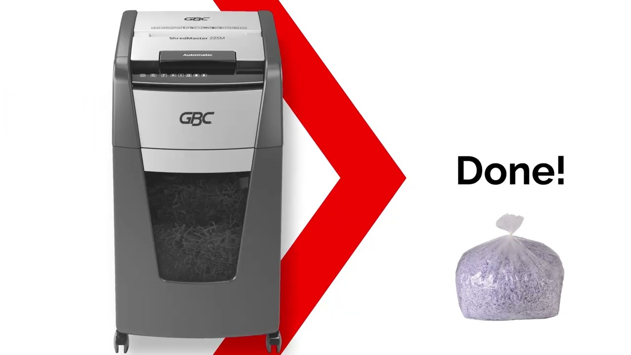 The GBC ShredMaster 225M is a high performance auto-feed paper shredder machine designed to bring maximum security and hands-free convenience to small and medium offices. Its standout feature is the “Stack, Shut, and Done” technology, which allows you to load up to 225 sheets into the auto-feed tray and walk away. The GBC Auto Feed Paper Shredder Machine ShredMaster 225M automatically shreds the entire stack into tiny 2x15mm micro-cut particles, providing elite P-5 security, perfect for highly confidential legal or financial records.