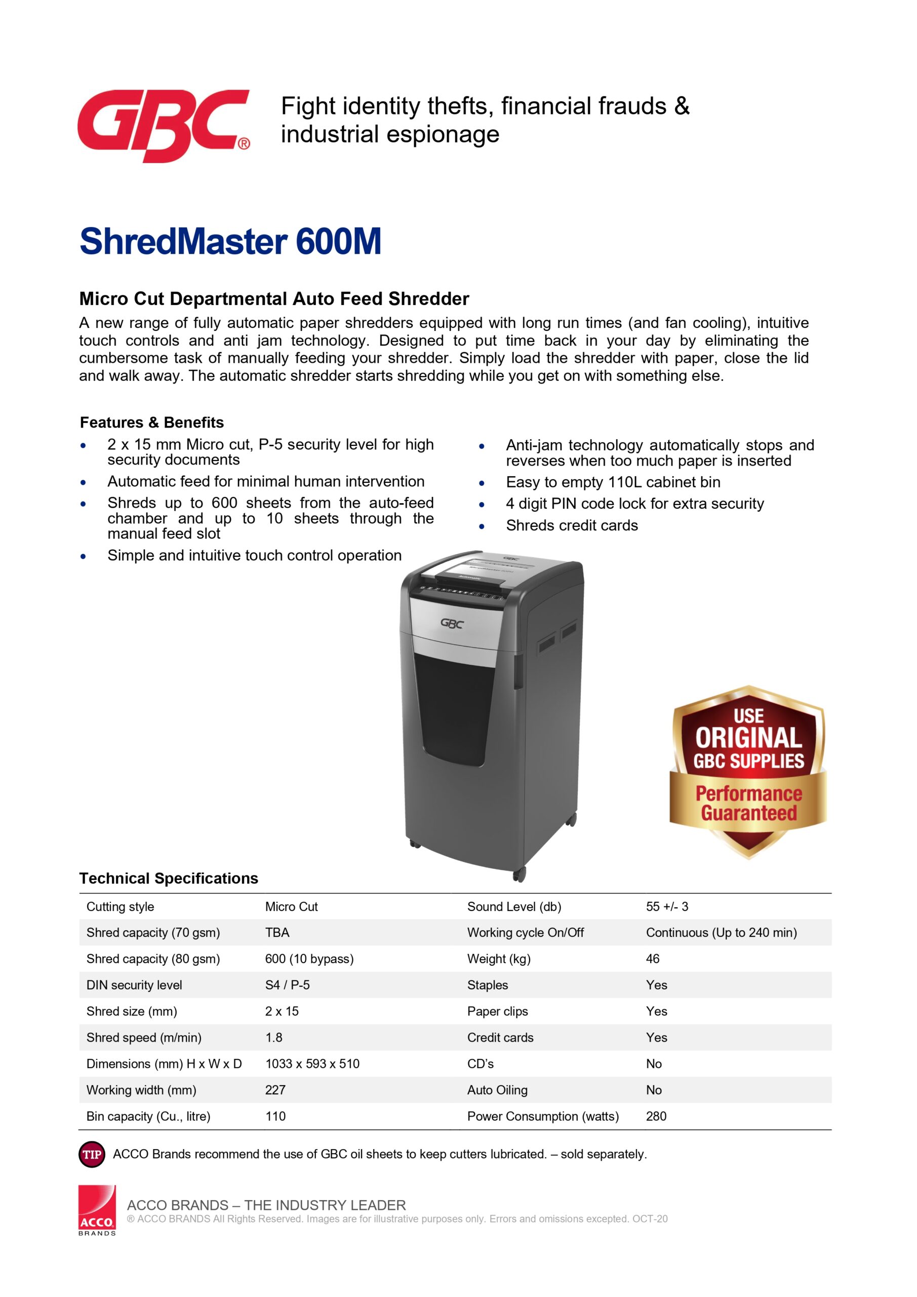 GBC Auto Feed Paper Shredder Machine ShredMaster 600M (Micro-Cut 2x15mm)