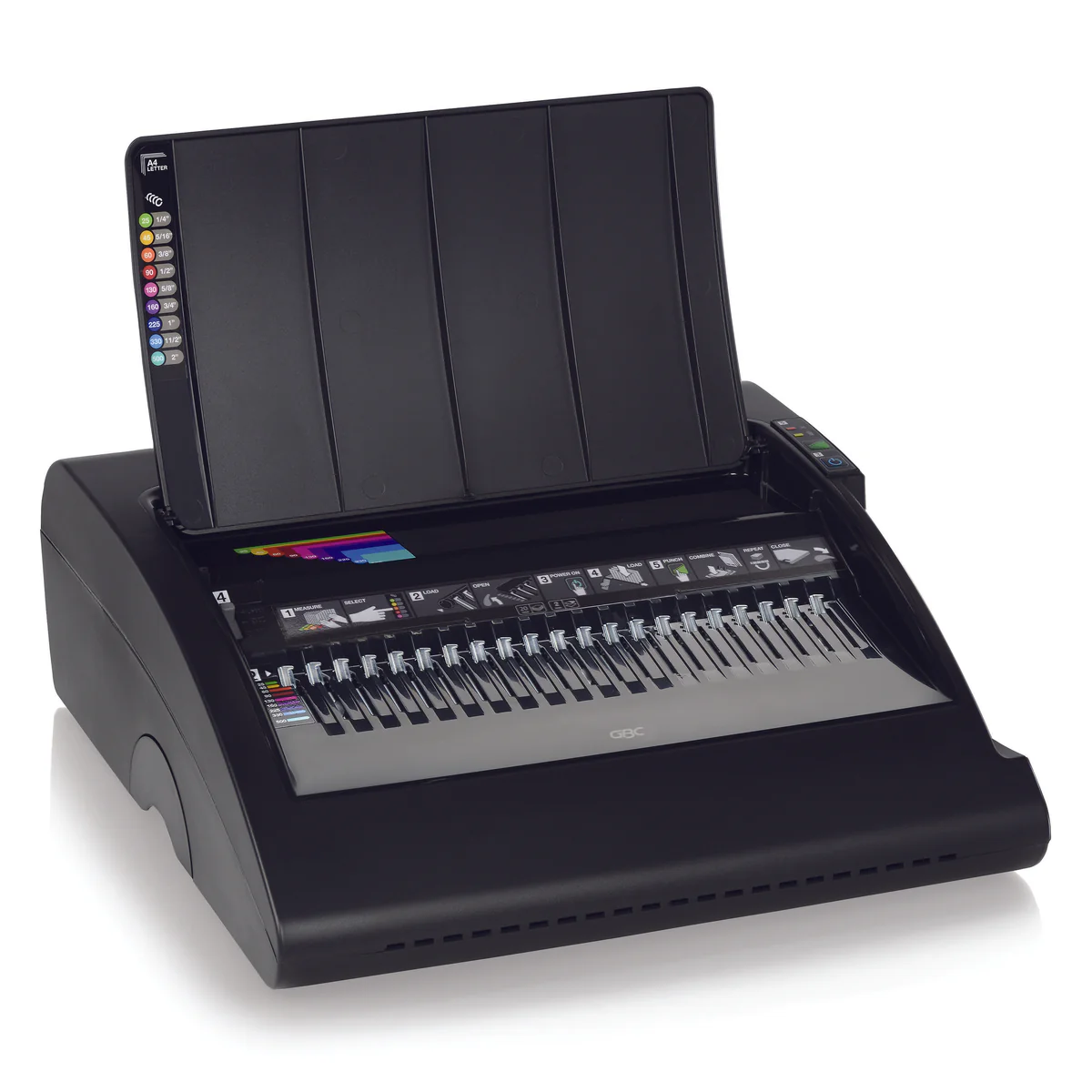 2. How do I know which size comb I need for my document? – There is a built-in color-coded document size guide on the machine. Simply place your stack of paper against the guide, and it will tell you exactly which spine size to use.