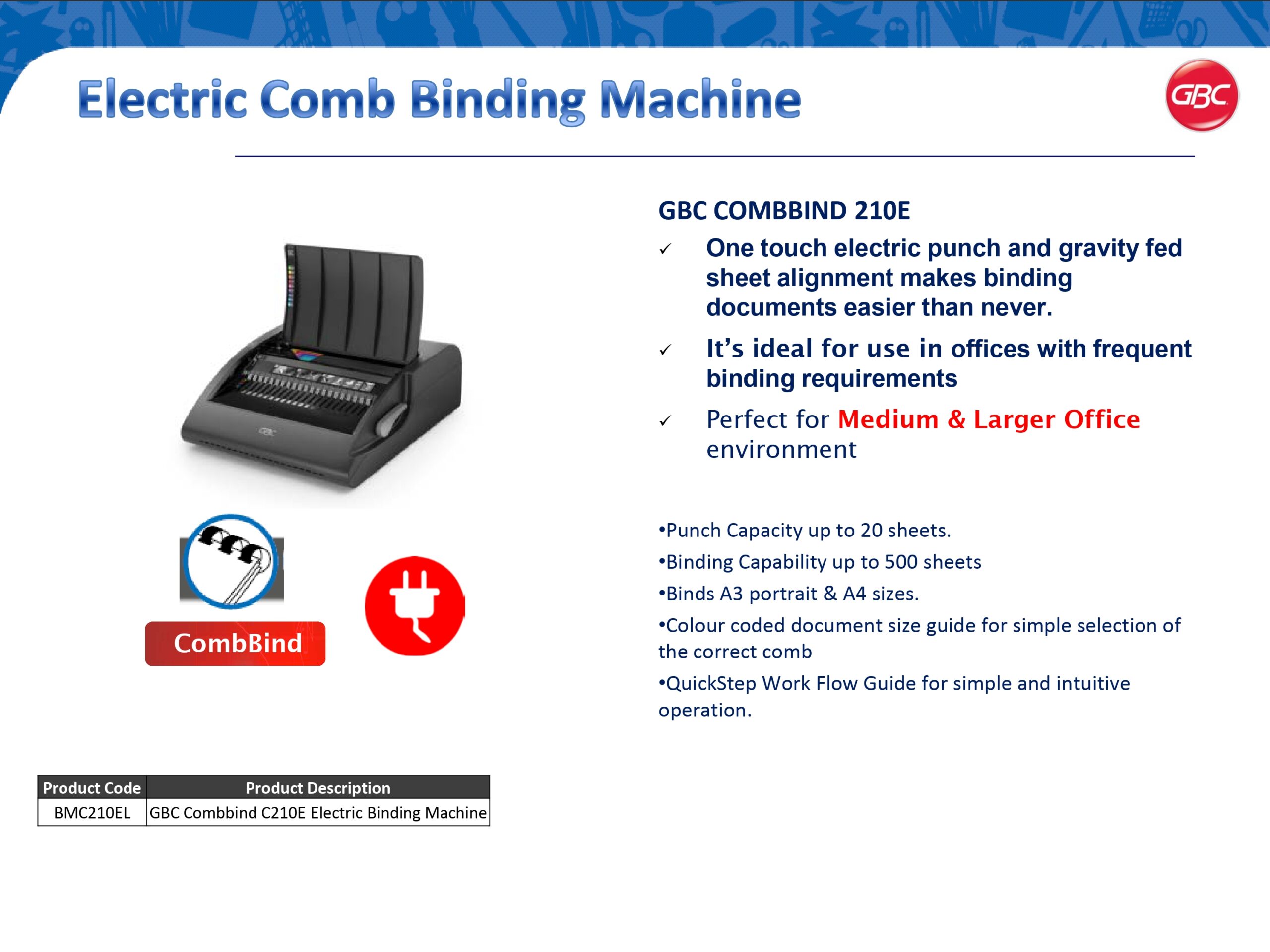 The GBC CombBind C210e is a high performance electric binding machine designed to take the manual effort out of document organization. Ideal for medium to large offices, it replaces traditional handle pulling with a one touch electric punch button, allowing you to prepare up to 20 sheets at once with zero physical strain. This electronic binding machine is a “workhorse” for creating professional looking reports, manuals, and presentations quickly and accurately.