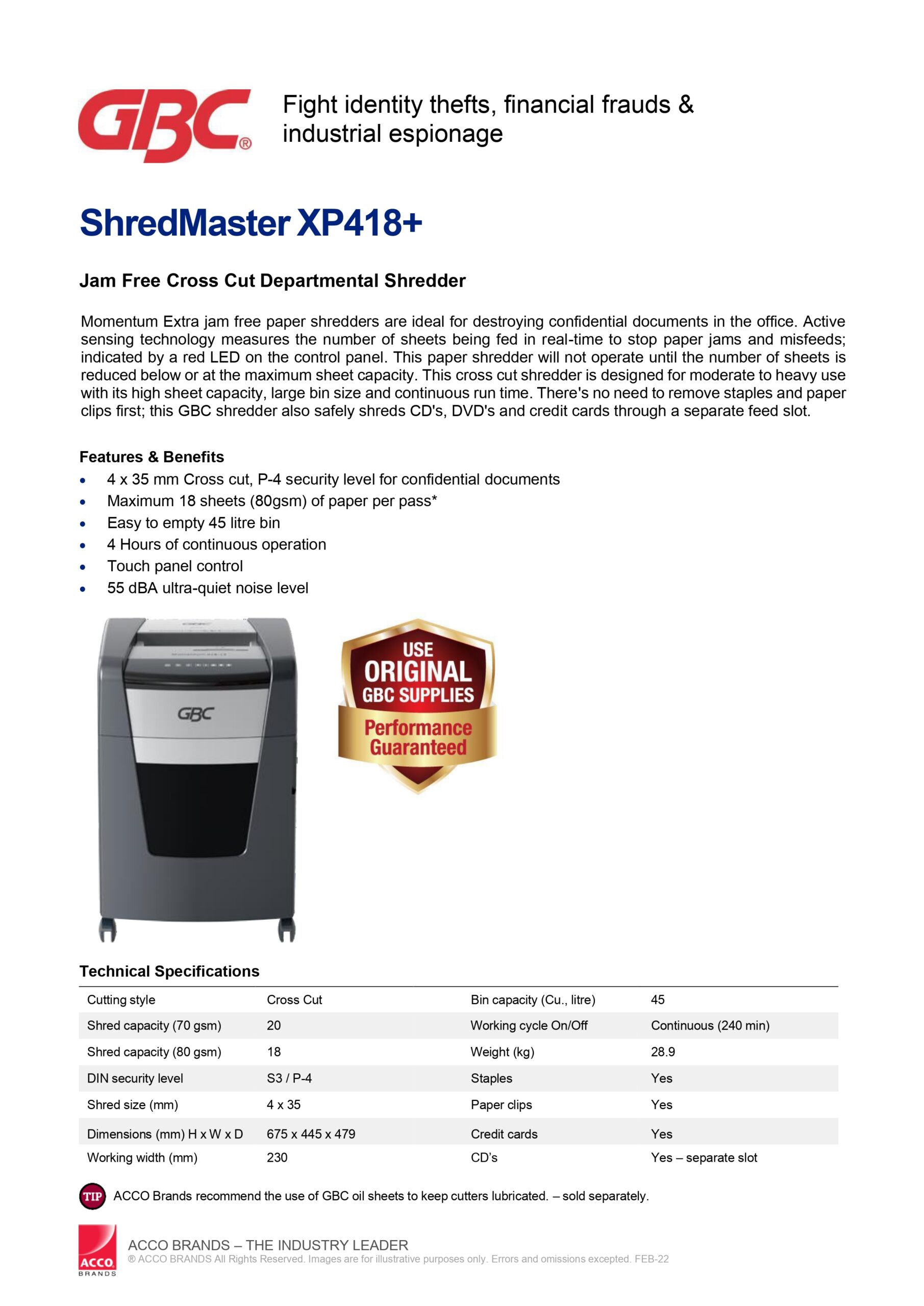 The GBC ShredMaster XP418+ is a powerful departmental paper shredder machine engineered for high volume office use. It features advanced Active Sensing Technology that prevents frustrating paper jams by measuring the number of sheets in real time. If you try to feed too much, the machine simply won’t start until the stack is reduced.
