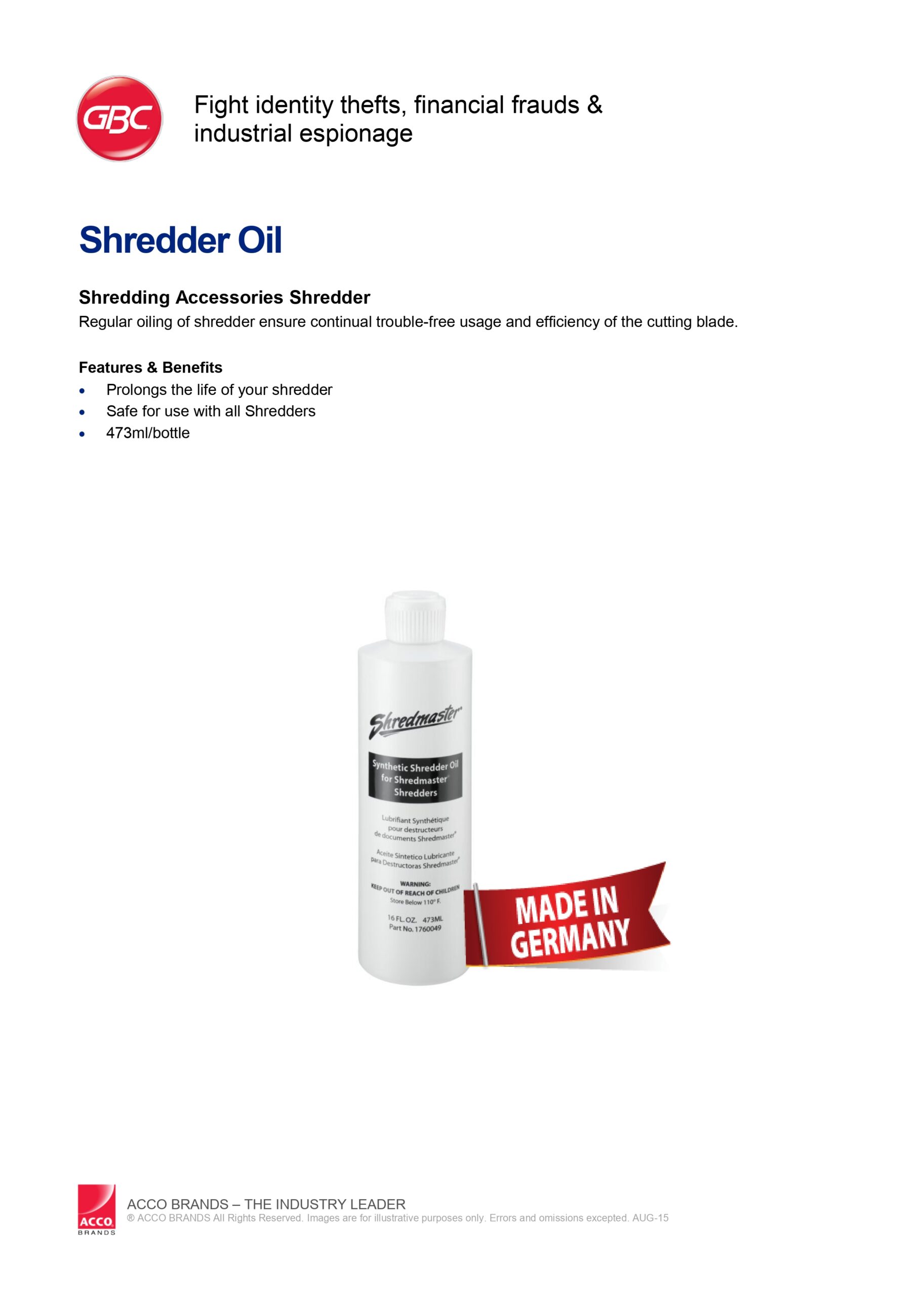 Unlike household oils that can leave sticky residues, GBC Paper Shredder Oil’s formula is non flammable and specially blended to prevent dust and paper particles from building up on the cutters. Whether you have a small home paper shredder machine or a massive departmental machine, this 16oz (473ml) squeezy bottle GBC Paper Shredder Oil makes application easy, just apply a few streaks to a sheet of paper or pour it into your machine’s auto-oil reservoir.
