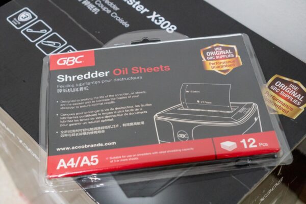 Designed to prolong the life of your paper shredder machine, these GBC Paper Shredder Oil sheet reduce friction and torque, allowing the motor to run smoothly and the blades to stay sharp. Regular use, recommended at least twice per month or whenever you empty the bin, prevents paper particles from building up, which significantly reduces the risk of paper jams.