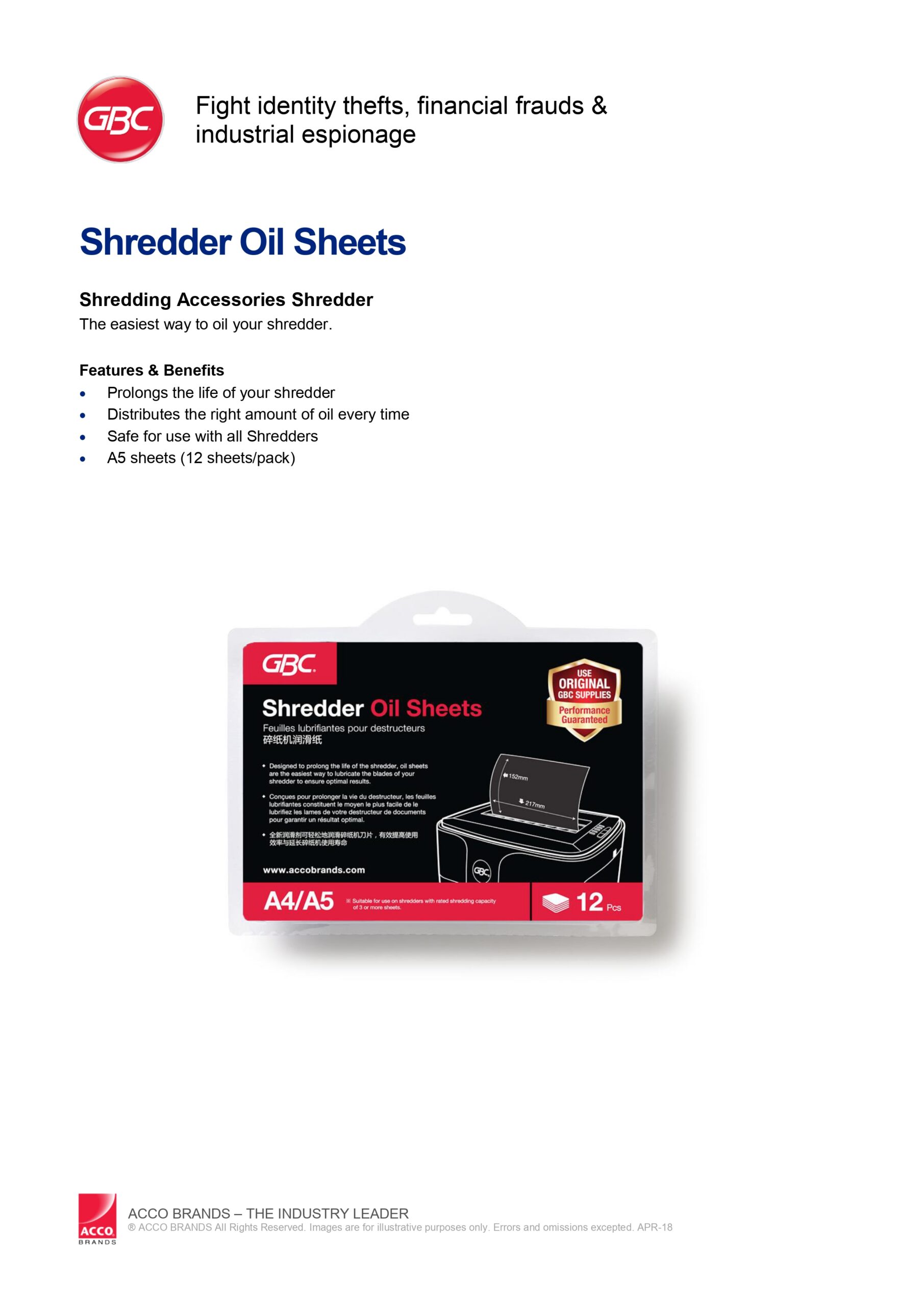 Compatible with all brands of cross cut and micro cut shredders, these GBC Paper Shredder Oil sheets ensure high performance document security without the greasy cleanup.