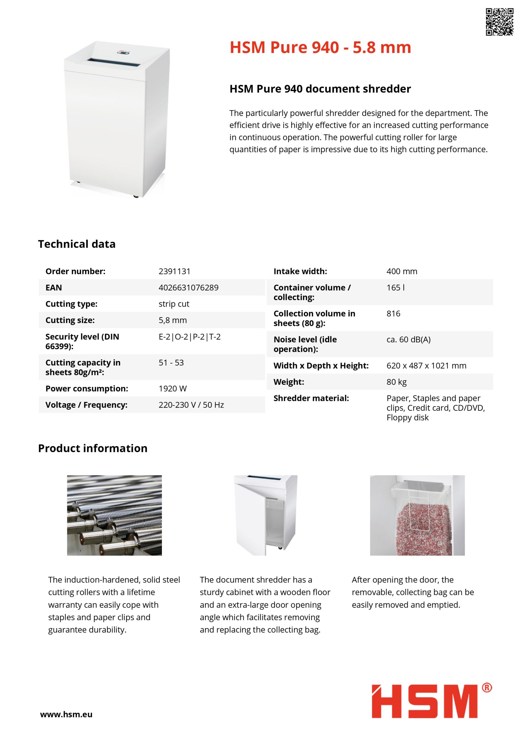 The HSM Heavy Duty Paper Shredder Machine Pure 940S is a high performance strip cut shredder built for large offices that handle big volumes of paper every day. With a massive cutting capacity of up to 67 sheets per pass, it makes quick work of documents, reducing them into 5.8mm strips.