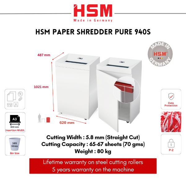 Made in Germany, it combines precision engineering with long lasting durability and quiet operation. Ideal for corporate offices, financial institutions, and government departments, the HSM Heavy Duty Paper Shredder Machine Pure 940S provides fast, reliable, and efficient document disposal, ensuring productivity and security in every shred.