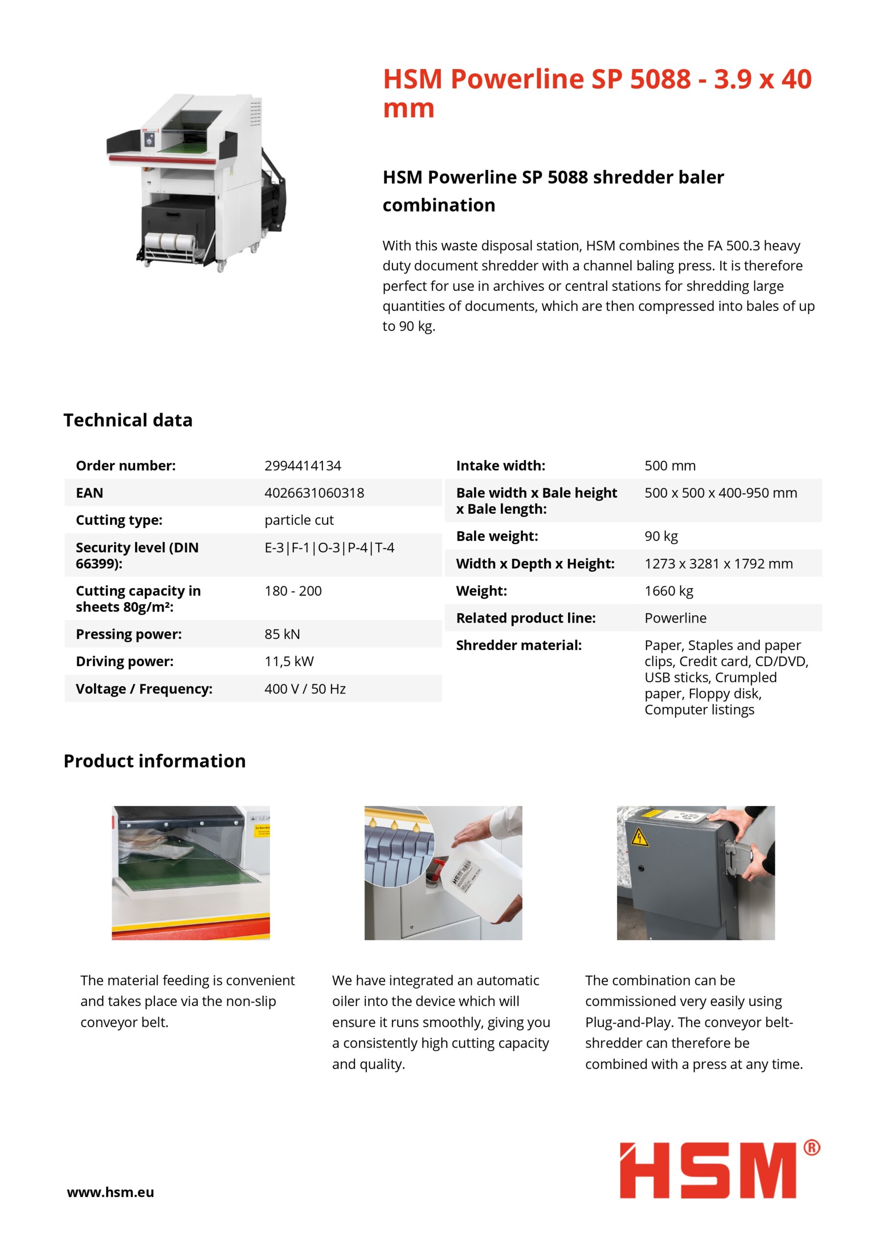 HSM Powerline Shredder Machine Baler Combination SP 5088 CC (Cross-Cut 3.9 x 40mm)